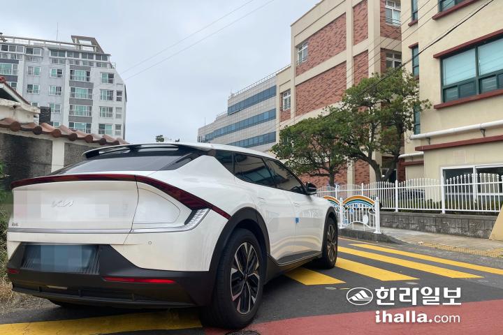9일 오전 제주시 삼도1동 삼성초등학교 뒷골목에 한 차량이 횡단보도를 가로막은 채 불법 주차돼 있다.