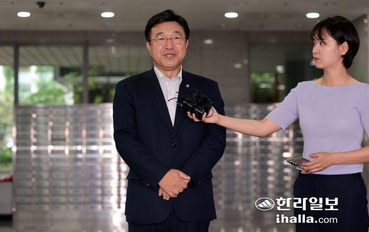 윤호중 행정안전부 장관 후보자가 지난달 30일 서울 종로구 적선동에 마련된 인사청문회 준비 사무실로 출근하며 취재진 질문에 답하고 있다. 연합뉴스
