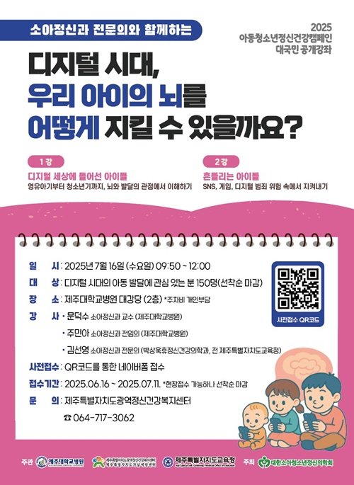 제주대병원과 제주도교육청이 공동 주관하는 이번 강좌에는 문덕수·주민아(제주대병원 정신건강의학과), 김선영(박상욱휴정신건강의학과) 소아정신과 전문의가 나서 ▷영유아기부터 청소년기까지 뇌와 발달의 관점에서 이해하기 ▷SNS, 게임, 디지털 범죄 위험속에서 지켜내기를 주제로 강연을 진행한다.