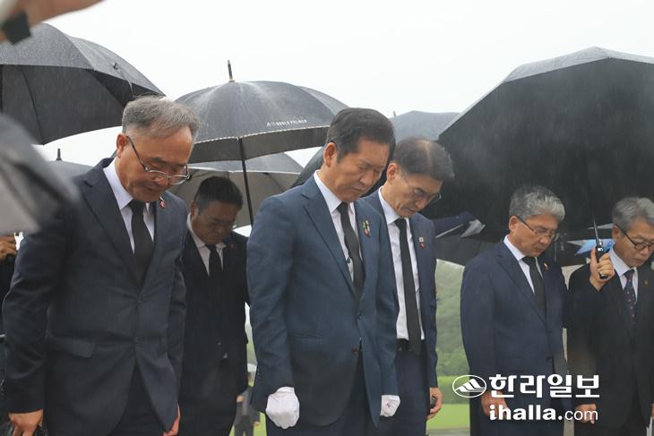 정청래 더불어민주당 당대표 후보(서울 마포구을)가 13일 제주4·3평화공원을 찾아 참배하고 있다.