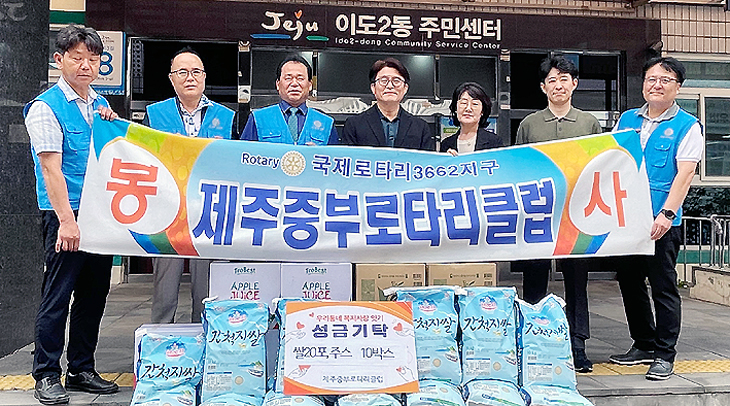 국제로타리 3662지구 제주중부로타리클럽(회장 장우진)은 지난 9일 쌀 200㎏와 음료 10박스를 이도2동(동장 한재영)에 기탁했다.