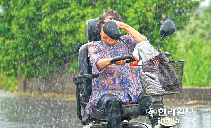 [한라일보] 13일 서귀포시 대정읍 도로변에 외출에 나섰던 한 어르신이 갑자기 많은 비가 내리자 서둘러 사륜오토바이를 타고 집으로 돌아가고 있다. 강희만기자