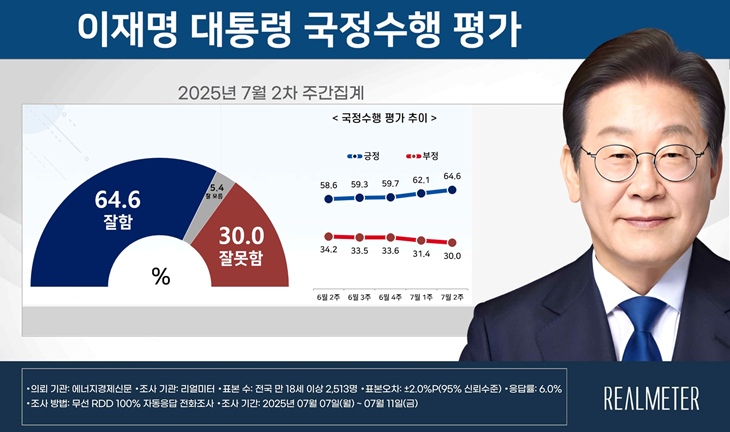 [한라일보] 이재명 대통령의 국정 수행을 긍정적으로 평가한 지지율이 64.6%를 기록했다는 여론조사 결과가 14일 나왔다.