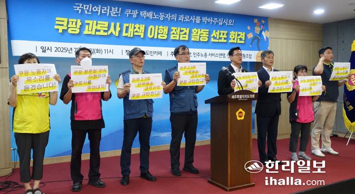 민주노총 서비스연맹 전국택배노동조합과 진보당 제주도당 등은 15일 제주도의회 도민카페에서 기자회견을 열고 ‘쿠팡 과로사 대책 이행점검단’ 활동을 시작한다고 밝혔다.