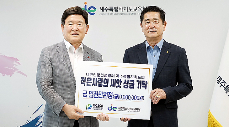 대한전문건설협회 제주특별자치도회(회장 백상훈)는 지난 14일 제주특별자치도교육청(교육감 김광수)에 '작은 사람의 씨앗' 성금 1000만원을 기탁했다.