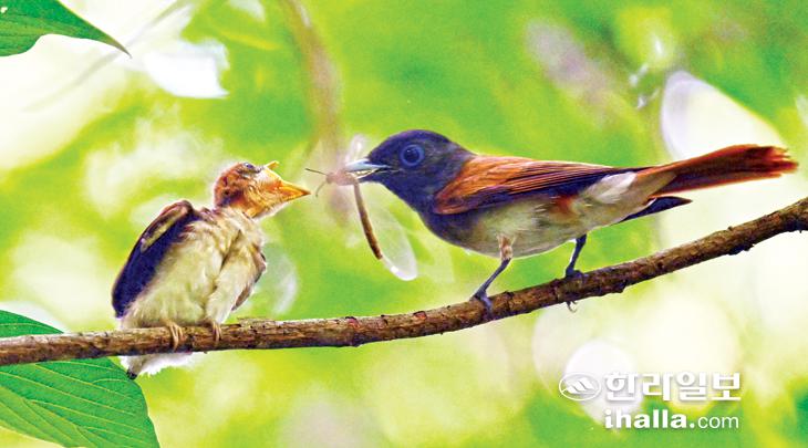 [한라일보] 15일 서귀포시 성산읍 제주자연생태공원내 궁대오름 숲에서 긴꼬리딱새 암컷이 둥지를 벗어나 주변나무에 앉아 있는 새끼에게 먹이를 주고 있다. 강희만기자
