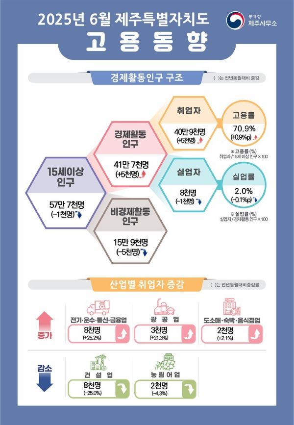 통계청 제주사무소가 16일 발표한 '2025년 6월 고용동향'에 따르면 지난달 제주지역 15세 이상 취업자는 40만9000명으로 집계됐다. 지난해 같은 달보다는 5000명(1.3%) 증가한 수치로, 지난 5월(0.5%)에 이어 두 달 연속 증가세다. 이는 2023년 11월(41만1000명) 이후 가장 많은 수준이다.