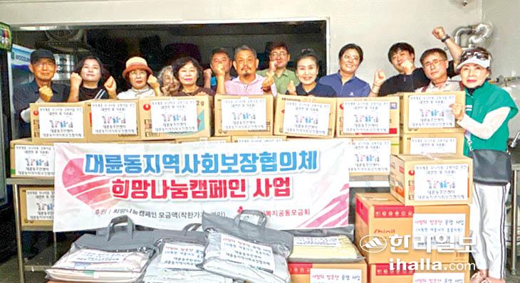 서귀포시 대륜동지역사회보장협의체(위원장 김길명)는 지난 10일 대륜동 지역 내 홀로사는 어르신과 1인가구 등 취약계층 30가구에 삼계탕 등 식료품과 선풍기 등을 나눠 전달했다.