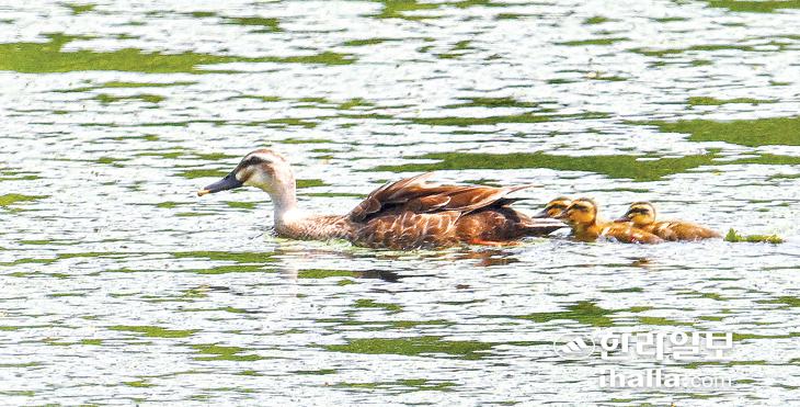 [한라일보] 16일 제주시 애월읍 수산저수지에 갓 태어난 흰뺨검둥오리 새끼들이 어미를 따라 유영하고 있다. 강희만기자