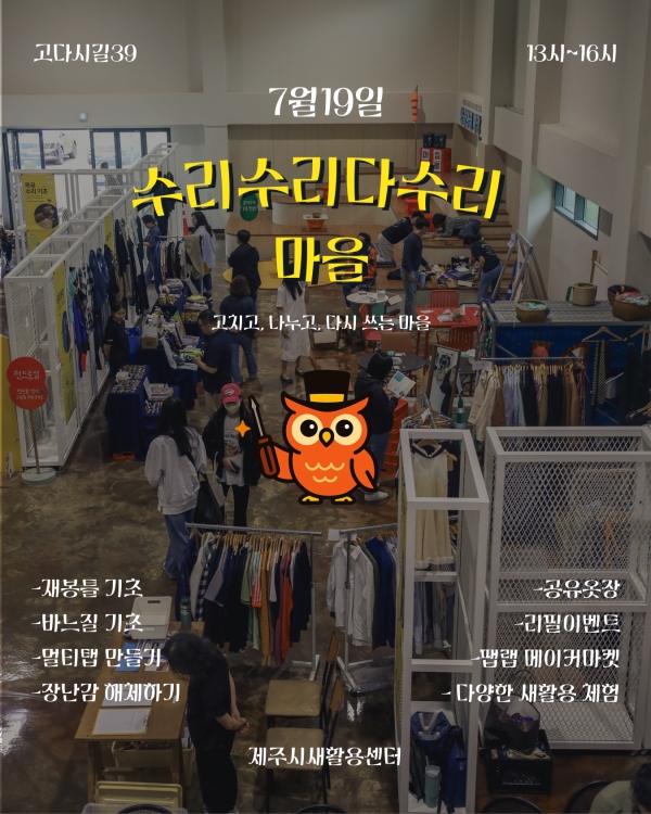 제주시새활용센터는 오는 19일 특별 프로그램 ‘수리수리다수리마을’을 개최한다고 17일 밝혔다.