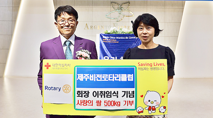국제로타리클럽 3662지구 제주비전로타리클럽(회장 이상현)은 대한적십자사제주특별자치도지사(회장 정태근)에 회장 이취임식을 기념해 사랑의 쌀 500㎏을 기탁했다.