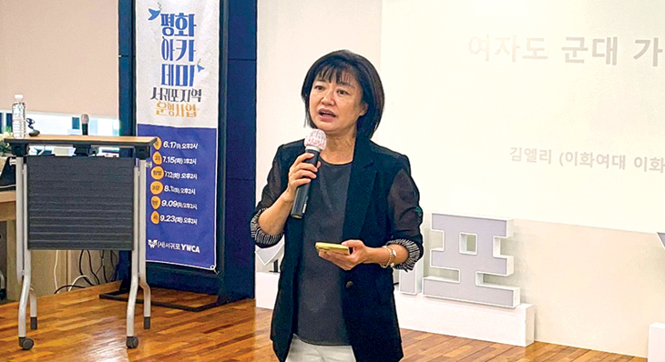 강연은 '평화&성인권-여자도 군대가라는 말'을 주제로 이화여대 김엘리 교수가 강연했다.