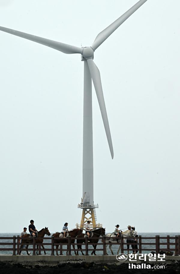 [한라일보] 17일 제주시 한경면 신창풍차해안을 찾은 관광객들이 풍력발전기를 배경으로 조랑말체험을 하고 있다. 강희만기자