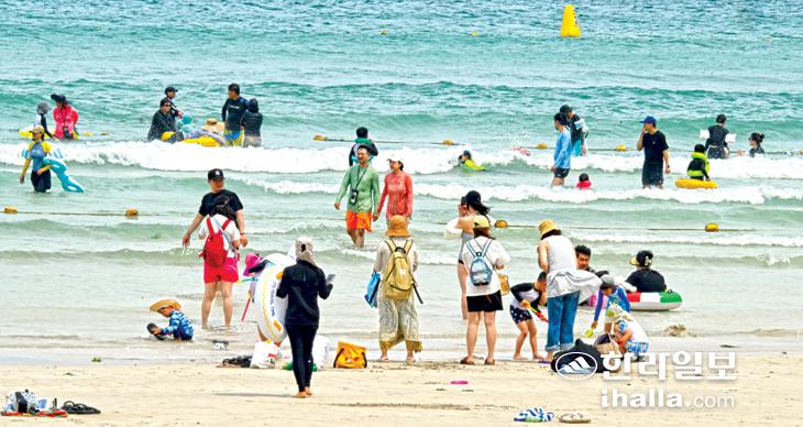 17일 제주시 한림읍 협재해수욕장에 많은 피서객들이 찾아 물놀이를 즐기며 무더위를 식히고 있다. 강희만기자