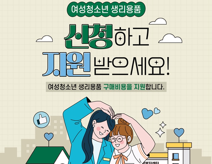 '여성 청소년 생리용품 지원 사업'은 국비(50%)에 지방비를 더한 예산으로 추진되고 있다. 기초생활보장 수급, 차상위 계층, 한 부모 가족 대상 가구의 9~24세 여성 청소년을 대상으로 2025년 기준 1인당 월 1만4000원(연 최대 16만8000원)을 지원한다. 전년에 비해 1인당 지원액이 소폭 인상됐고 오프라인 신청 시 주민등록상 주소지와 실제 거주지가 다른 경우 현재 살고 있는 읍면동에서 접수할 수 있도록 개선했다.