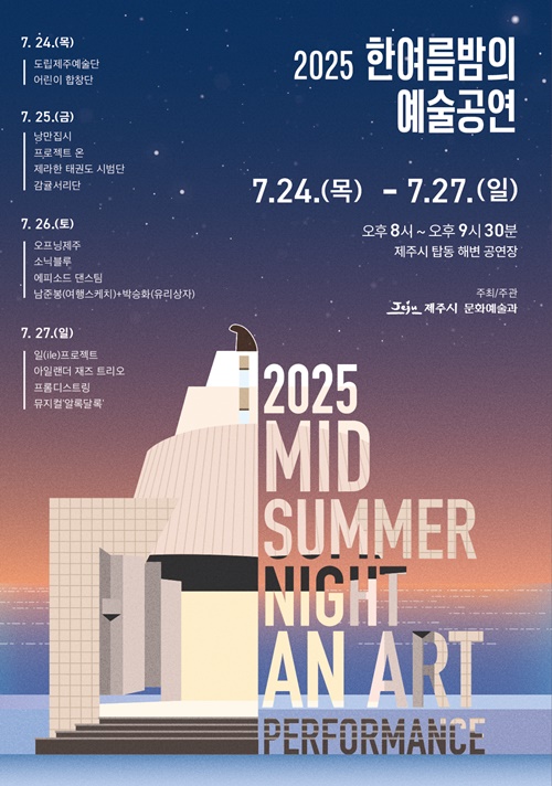 [한라일보] 제주시는 이달 24일부터 27일까지 4일간 탑동 해변공연장에서 '2025 한여름밤의 예술공연'을 연다. 축제 기간 공연은 오후 8시부터 1시 30분 동안 진행된다.