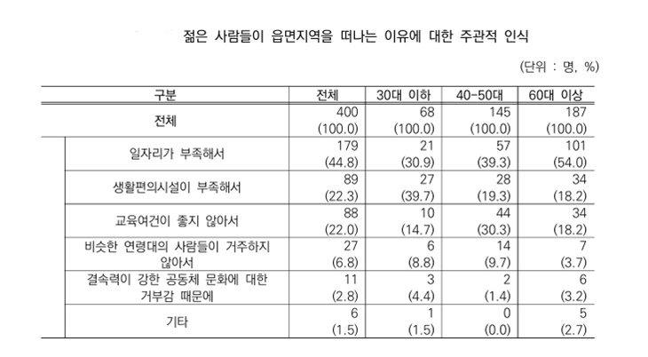 젊은 사람들이 읍면 지역을 떠나는 이유에 대한 주관적 인식 조사에서는 일자리 부족(44.8%), 생활편의시설 부족(22.3%), 교육 여건(22.0%) 등 순으로 답했다. 연령대별로는 다소 차이가 났다. 30대 이하 청년들은 일자리 부족(30.9%)보다는 병원, 마트, 여가 공간 등 생활편의시설 부족(39.7%)을 더 중요한 사유로 인식했지만 40대 이상 중장년과 고령층은 일자리 부족을 대표적인 이유로 들었다. 이에 대해 연구진은 "읍면 지역에 사는 청년들이 출퇴근에 소모되는 시간이나 어려움보다 거주지 주변의 생활편의시설 부재에 대한 불편함을 더욱 크게 인식하고 있다는 의미"라고 해석했다.