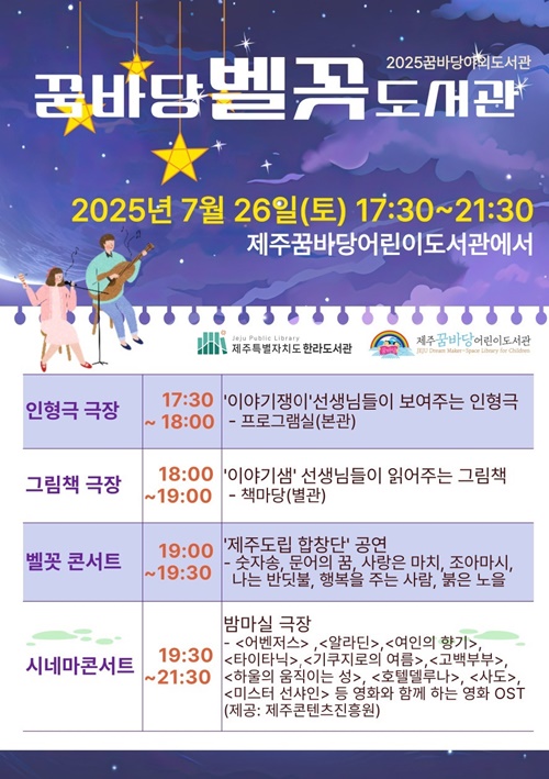 [한라일보] 제주특별자치도 한라도서관과 제주꿈바당어린이도서관, 제주콘텐츠진흥원은 이달 26일 오후 5시 30분부터 9시 30분까지 꿈바당어린이도서관 야외광장에서 복합형 북 버스킹인 '시네마 콘서트'를 연다.