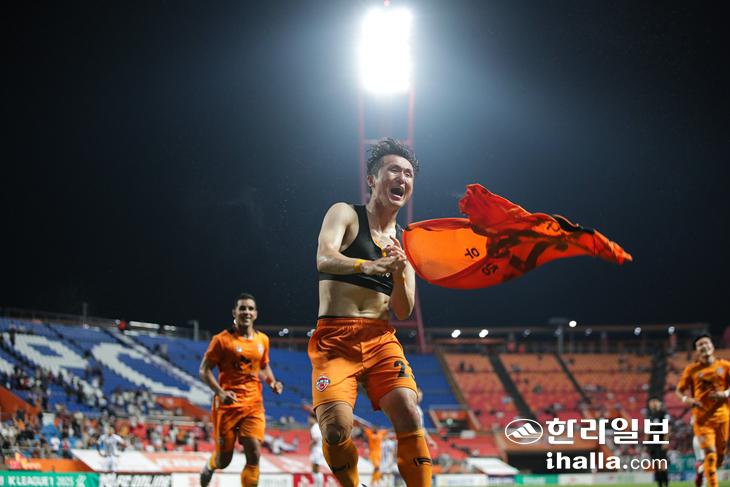 23일 FC서울과의 경기에서 후반 추가시간 결승골을 넣고 환호하는 제주 임창우. 한국프로축구연맹 제공
