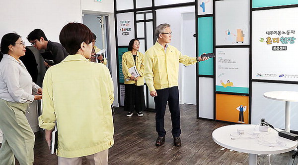 [한라일보] 진명기 제주도 행정부지사는 지난 22일 이동노동자 쉼터인 '혼디쉼팡' 서귀포센터와 중문센터를 방문해 시설을 점검하고 센터 관계자들을 격려했다. '혼디쉼팡'은 현재 4개소가 설치돼 연중 24시간 운영되고 있다.