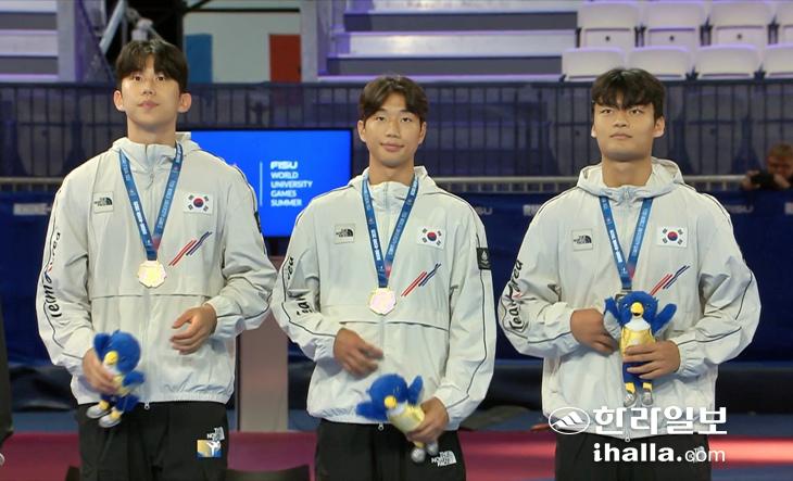 23일 끝난 2025세계대학경기대회 태권도 단체전에서 금메달을 따낸 대한민국 강상현, 김효혁, 서건우(왼쪽부터).