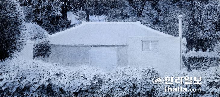 상덕천 마을 안길을 돌아다니며 평온한 느낌을 향유하다가 만난 모습을 그렸다. 오래된 기억을 메시지로 전달하기 위해 연필소묘를 선택하게 된 것이다. 채도를 모두 빼고 오직 명도가 지닌 광선의 강약으로 질감들을 뽑아내는 작업을 한 것이다. 집 뒤에 엄청 큰 나무들이 병풍처럼, 어떤 위대함의 품속처럼 서있고 그 앞에 집을 지었던 사람들의 마음을 그리려 했다. 그냥 자연이 품어주는 삶. 초록 자연이 새의 둥지라고 생각하며 살아온 사람들의 가치관과 철학이 그대로 풍경이 돼 나타난 것이다. 돌담을 모두 감싸고 있는 담쟁이 잎들이 7월의 뙤약볕 아래서 눈부시게 빛나고 있음을 향유하고 있는 것이다. 변소의 환기 기둥마저도 정겨움으로 다가오는 이 빛의 메아리들. 사람이 어디에 사는가 하는 것이 '어떻게 사는가'와 연동돼져 있다는 주장에 동의하지 않으나 이 그림을 그리면서 부정 할 수는 없게 됐다. 슬레트 지붕이 새마을운동 시절에 지붕개량한 것이라면 벌써 반백년의 세월이 흘렀을 것이다. 지난날들이 모두 저 지붕 아래서 지나갔을 터이니 어떠한 시간성을 태양광선과 함께 노래하고 있구나. 자연유산이라고 하는 거대한 지질학적 관점이 휘황찰란 해보여도 이 소박한 자연주의를 앞서지는 못한다. 세계자연유산마을에 사는 사람들이 지니고 있는 심성이 소중한, 잃어서는 안될 그 무엇을 이미 실천하고 '동일체가 돼 있다' 라는 사실을 그리려 한 것이다. 온통 초록이니 채색을 한들 상상력의 제약요인으로 작용할 것이 뻔하기에.