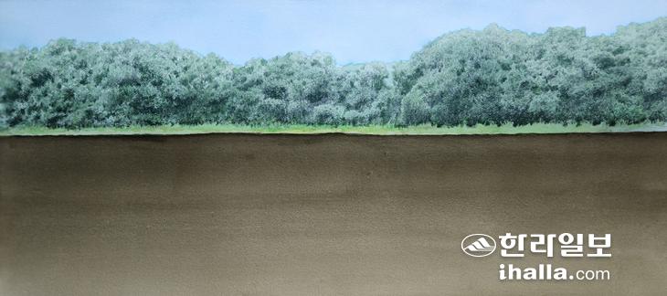 극명한 차별성을 그렸다. 섬 제주가 화산도라는 것을 입증하는 흙. 화산회토로 이뤄진 밭. 이 일대가 세계자연유산으로 지정된 것은 거문오름에서 만장굴에 이르는 지구별에서 지질작용이 그 희귀성을 인정 받았기에 그렇다면 그 영향이 빚어낸 흙들은 또한 엄청난 학술적 가치를 지니고 있는 것이다. 그러한 내용을 그리려 한 것이 아니라 시각적 매료 때문이다. 다른 지역에 비해 갈색이 많이 사라진 짙은 무게감이 태양광선을 받아서 오묘한 빛깔로 다가오기 때문에 그린 것이다. 이 곳의 위치는 우리가 알고 있는 놀라운 인물, 거상 김만덕 일가의 비석이 있는 곳을 찾아가는 길에 만나게 된 것이다. 기록에 의하면 김만덕의 부모는 덕천리에서 살았다고 한다. 지금도 그 친척 후예들이 살고 있고. 여덟 살 되던 해에 돌림병으로 부모님이 2남 1녀 아이들을 남기고 사망했다. 이후에 김만덕이라고 하는 소녀의 일생을 덕천리를 떠나서 파란만장한 인생을 살아간다. 거상으로 성장해 흉년에 굶어 죽는 이들을 살려낸 선행을 통해 세상을 감동시킨 장본인이다. 그녀의 고향이라고 할 수 있는 곳에서 그 혈족들의 묘지를 찾아가다가 만난 풍경에 더욱 감동해 그린 것이다. 하늘과 땅 사이에 숲이 있을 뿐이다. 화면 안에서는 그렇다. 자연주의자들의 마을다운 메시지를 만나니 기뻐서 신바람 나게 연필담채화 기법으로 숲을 그려나갔다. 땅에 대비되는 하늘은 어찌해 저리도 밝은가? 흙이 베푸는 마음과 김만덕의 마음을 동치 시키고 싶은 억지를 부리고 있다.