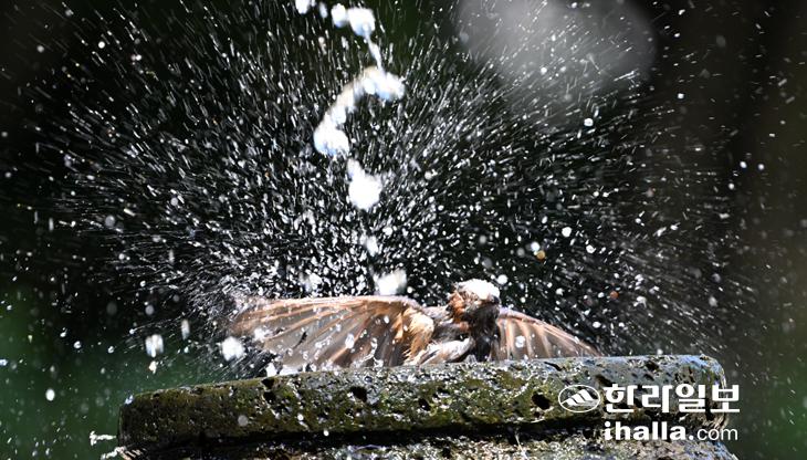 [한라일보] 폭염이 이어진 24일 제주시 제주민속자연사박물관 내 해녀상 분수대에서 무더위에 지친 직박구리가 차가운 물로 목욕을 하며 더위를 식히고 있다. 강희만기자