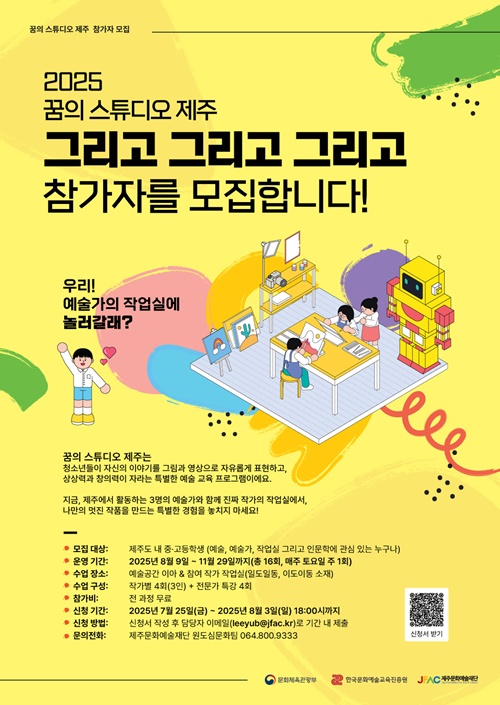 제주문화예술재단은 청소년 창의예술교육 프로그램 '2025 꿈의 스튜디오 제주'를 오는 8월부터 11월까지 운영한다고 25일 밝혔다.