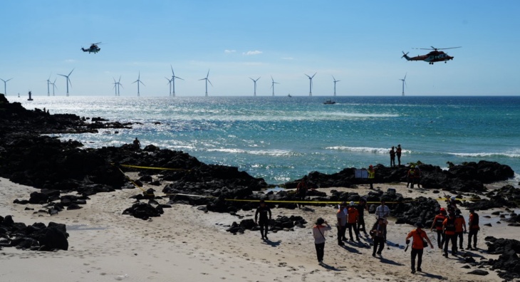 119 등이 제주시 애월읍 곽지해수욕장에서 심정지 상태의 30대 남성을 구조해 소방헬기로 도내 종합병원으로 긴급 이송하고 있다. 오하준 독자 제공
