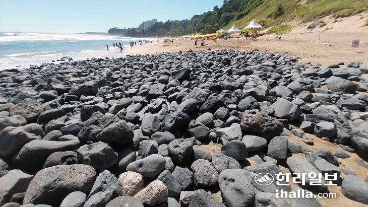 [한라일보] 26일 서귀포시 중문해수욕장 백사장 모래가 유실돼 현무암 바위들이 모습을 드러냈다. 강희만기자