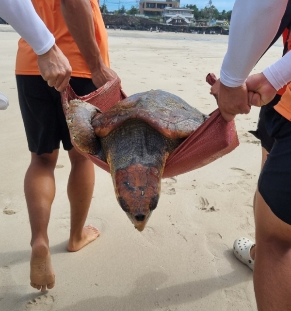 지난 27일 오후 3시 20분쯤 서귀포시 표선해수욕장 앞 해상에서 붉은바다거북 한 마리가 발견돼 해경이 구조에 나섰다. 서귀포해양경찰서 제공