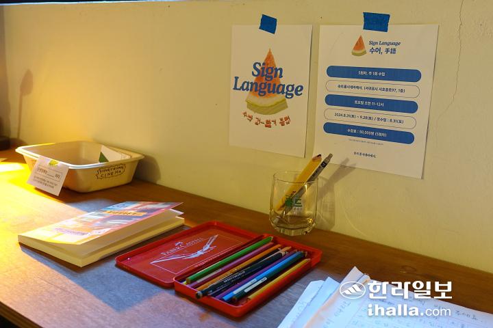 단편영화관 ‘숏트롱시네마’에서 운영되는 '수박겉핥기' 클럽 포스터. 아래는 방명록 노트와 색연필이 있다.