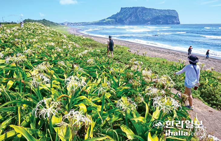 [한라일보] 29일 서귀포시 성산읍 해안에 만개한 문주란이 성산일출봉과 어우러지며 환상적인 풍경을 만들어 내고 있다. 강희만기자