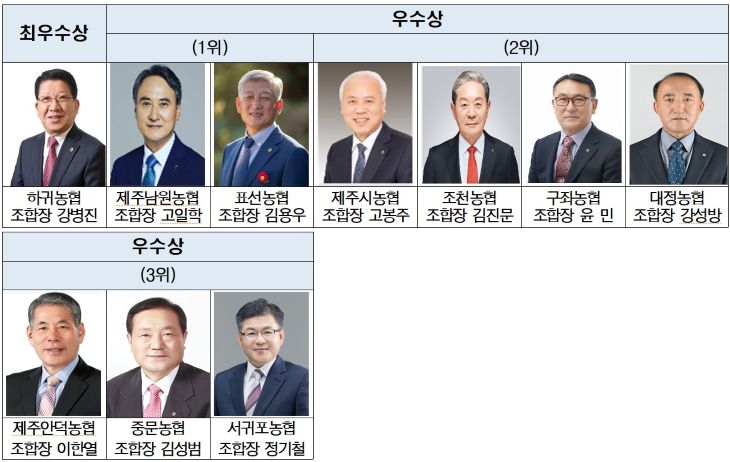 이번 평가에서 하귀농협(조합장 강병진)은 '최우수상'에 이름을 올렸고, 제주남원농협(조합장 고일학), 표선농협(조합장 김용우)은 우수상 1위, 제주시농협(조합장 고봉주), 조천농협(조합장 김진문), 구좌농협(조합장 윤민), 대정농협(조합장 강성방)은 우수상 2위, 제주안덕농협(조합장 이한열), 중문농협(조합장 김성범), 서귀포농협(조합장 정기철)은 우수상 3위를 각각 수상했다.