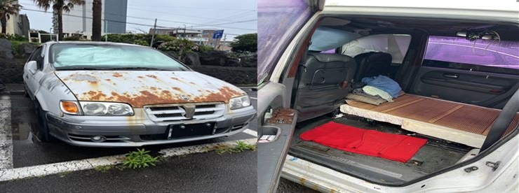 한 50대가 10년 동안 혼자 생활해 온 제주시 삼양해수욕장 인근 주차장에 세워진 폐차량. 제주시 제공