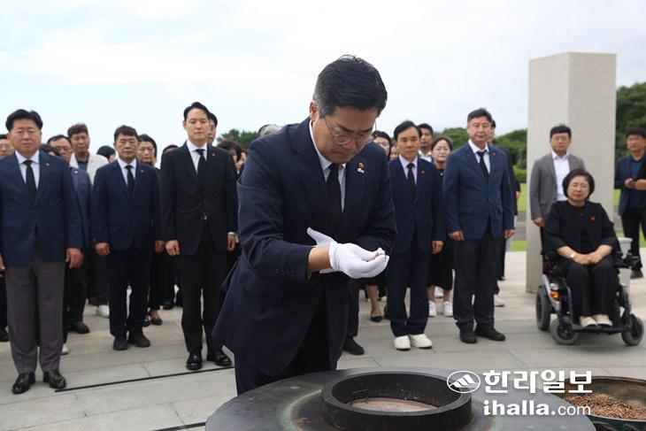 박 의원은 이날 오후 오영훈 제주도지사, 김한규 국회의원(제주시 을), 이상봉 제주도의회 의장, 김창범 제주4.3희생자유족회장, 4·3단체 관계자들과 함께 제주시 봉개동 4·3평화공원 위령제단과 위패봉안실을 참배했다.
