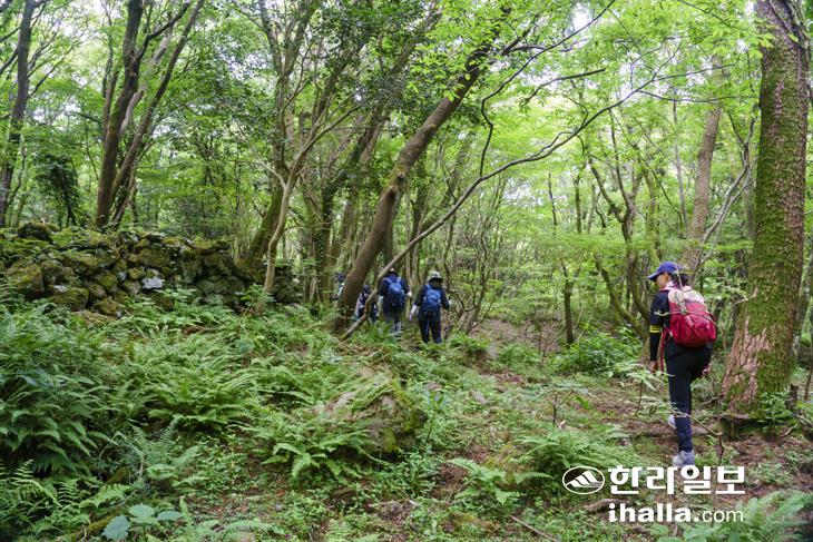 첫 출발지인 한라산버섯연구소는 표고버섯 재배지로 번성했던 곳이다. 사유지이지만 사전에 양해를 구해 민모루오름 들머리까지 여유로이 이동했다. 한적한 숲길은 곳곳에 쌓인 표고목을 제외하면 사람 손길이 닿지 않은 자연 그대로의 모습이다. 따로 길 표식이 없기 때문에 앞사람을 놓칠 새라 부지런히 걸음을 옮기는 사이 어느새 민모루오름에 닿았다. 민모루오름은 해발 882m, 높이 82m에 달하지만 여느 오름과 달리 봉우리가 평평해 마치 평지처럼 보인다.