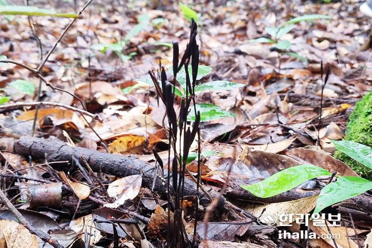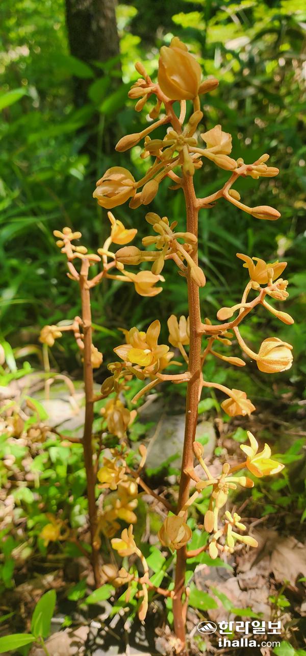 도민들의 식탁에 자주 오르는 양하(양애) 군락지를 지나 중문천 지류 숲길로 들어섰다. 나무 그늘이 드리워진 숲 안쪽에 도시락을 펼치고 쉬어가는 시간, 멸종위기 야생식물 2급으로 지정된 으름난초가 눈길을 사로잡았다. 열흘 전 사전답사 때는 꽃이 펴 있었는데 이날은 '으름'처럼 생긴 열매들을 주렁주렁 매달고 있었다. 그래서 으름난초란 이름이 붙었다고 한다. 쉽게 보기 힘든 귀한 식물을 우연찮게 만나다니, 왠지 모르게 행운이 따른 듯한 기분이었다.