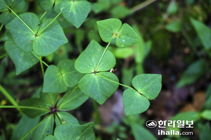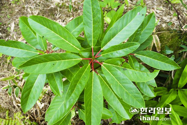 인적 드문 숲은 온통 조릿대 차지다. 발목부터 허리춤까지 높낮이를 달리해 자라난 조릿대들이 끊임없이 이어진다. 조릿대를 헤쳐 나갈 때마다 사그락 사그락 숲 속에 파도소리가 흘러넘친다. 여기에 섬휘파람새와 두견새 등이 호로롱 거리며 하모니를 이뤄 발걸음을 가볍게 만들어 줬다. 조릿대 너머로는 갖가지 나무들이 탐방객을 반겼다. 가장 많이 보이는 굴거리나무는 유난히 붉은 잎자루와 사철 푸른 잎이 특징이다. 봄철 새 잎이 날 땐 원래 있던 잎이 고개를 숙이며 자리를 내준다. 고단한 삶을 살아온 제주 여인들의 애환을 담은 민요의 소재로도 등장한다. 탐방 내내 굴거리나무가 가야 할 길을 인도해 줬다.