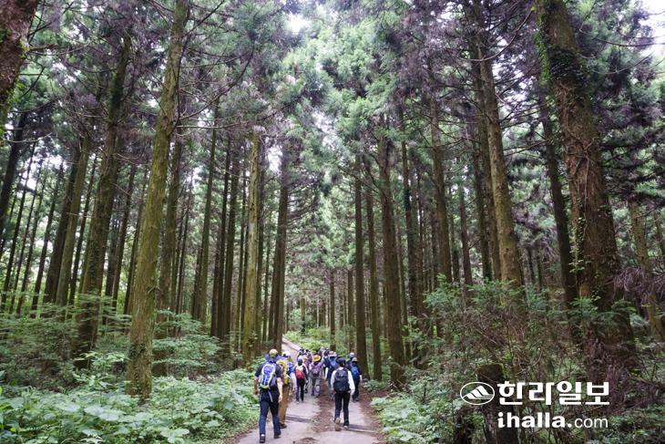 지난달 12일 진행된 '2025 제주섬 글로벌 에코투어 2차 행사' 참가자들이 한라산 중턱 삼나무가 우거진 숲길을 걷고 있다. 정은주 여행작가
