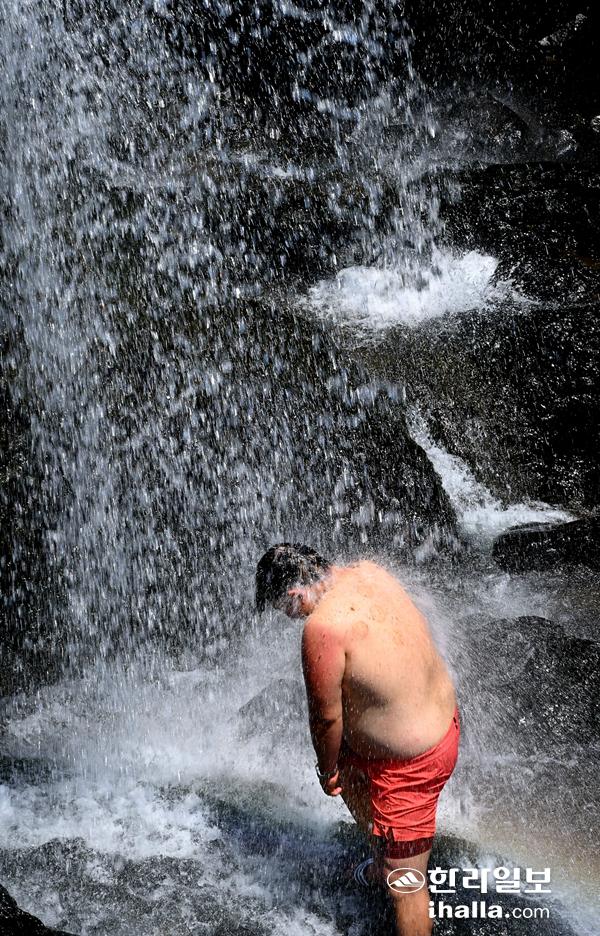 [한라일보] 폭염특보가 발효되면서 낮 최고체감온도가 35℃ 안팎까지 올라간 1일 서귀포시 소정방폭포를 찾아 한 시민들이 물맞이로 더위를 식히고 있다. 강희만 기자