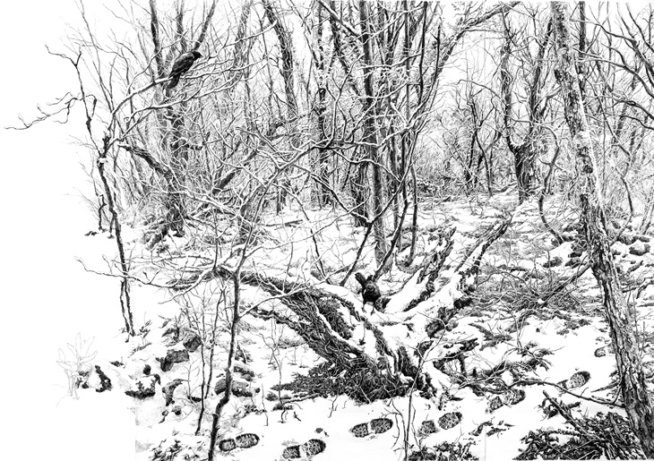 작가는 직접 발로 걸어 닿은 현장들로만 그림을 그려왔다. 지난 10년간 캔버스 위에 작은 붓펜으로만 그 모습을 담아왔다. 밑그림 없이 자유로운 선으로 시작된 그림은 숲이 되고, 밭이 되고, 잃어버린 마을이 됐다. 작가의 펜화에는 인물이 거의 등장하지 않는다. 그러나 사라진 마을의 나무와 풀, 꽃 한 송이까지도 정성스레 담았다.