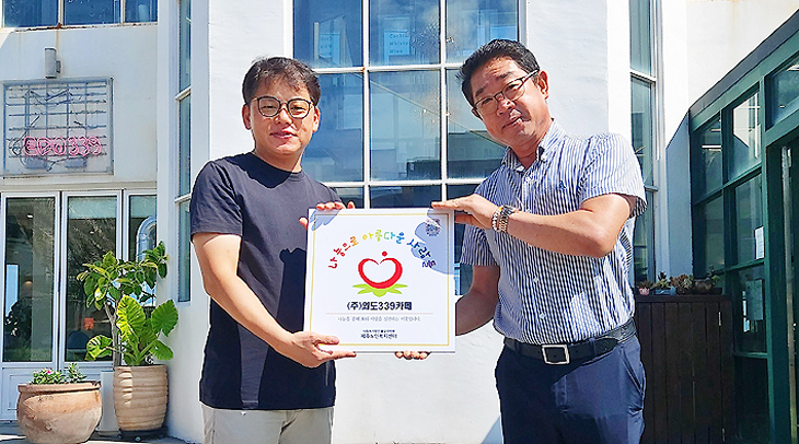 (주)외도339카페(대표 강성민·이사 고재웅)는 최근 제주노인복지센터로부터 '나눔으로 아름다운 사람들' 인증 후원판을 전달받았다.