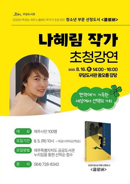 제주시 우당도서관은 이달 16일 오후 2시 꿈오름강당에서 '2025년 책 읽는 제주시 올해의 책' 청소년 부문으로 선정된 도서 '클로버'의 나혜림 작가 초청강연을 연다.
