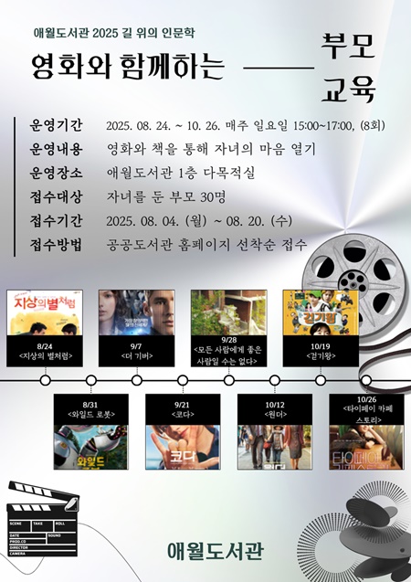 제주시 애월도서관은 '2025년 길 위의 인문학' 공모사업의 일환으로 문화프로그램 '영화와 함께하는 부모교육'을 운영한다.