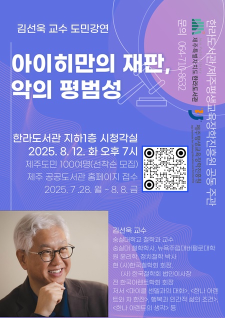제주도 한라도서관과 제주평생교육장학진흥원은 국내 대표 철학자 김선욱 교수를 초청해 '아이히만의 재판, 악의 평범성'을 주제로 도민강연을 연다. 강연은 이달 12일 오후 7시부터 9시까지 한라도서관 시청각실에서 진행된다.