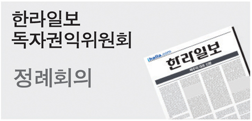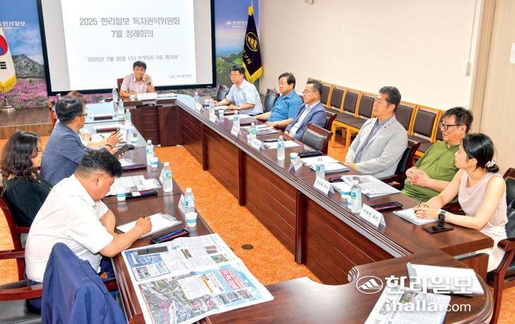 [한라일보] 한라일보 독자권익위원회는 지난달 30일 한라일보 3층 대회의실에서 7월 정례회의를 열고 한라일보 지면과 보도 내용 등에 대해 이야기를 나눴다. 이날 정례회의에는 김찬수(한라산생태문화연구소장) 위원장을 비롯해 강민숙(전 제주도의회 의원)·문만석(사단법인 한국지역혁신연구원장·법학박사) 부위원장, 이춘협(농협 제주본부 부본부장)·김미리(해담은집 원장)·김보형(제주도관광협회 경영지원국장)·이정언(법률사무소 제주드림 대표변호사)·황석규(제주다문화교육복지연구원장)·황경남(주식회사 나눔 대표)·홍태욱(제주시자원봉사센터 감사)·고광언(사단법인 제주중독예방교육원장)·김은미(미 서비스아카데미 원장)·백영미(제주도어린이집연합회 이사) 위원과 고대로 편집국장이 참석했다.