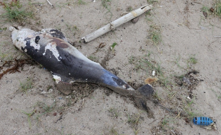 제주시 구좌읍 종달리 해상에서 낚시줄에 걸린 채 어미와 유영하던 새끼 남방큰돌고래가 일주일 만에 인근 해안에서 사체로 발견됐다. 다큐제주 제공