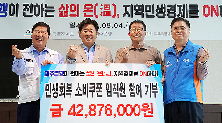 제주은행(은행장 이희수)은 4일 임직원들이 자발적으로 모금한 정부의 '민생회복 소비쿠폰' 4300만원을 대한적십자사 제주특별자치도지사(회장 정태근)에 기부했다.